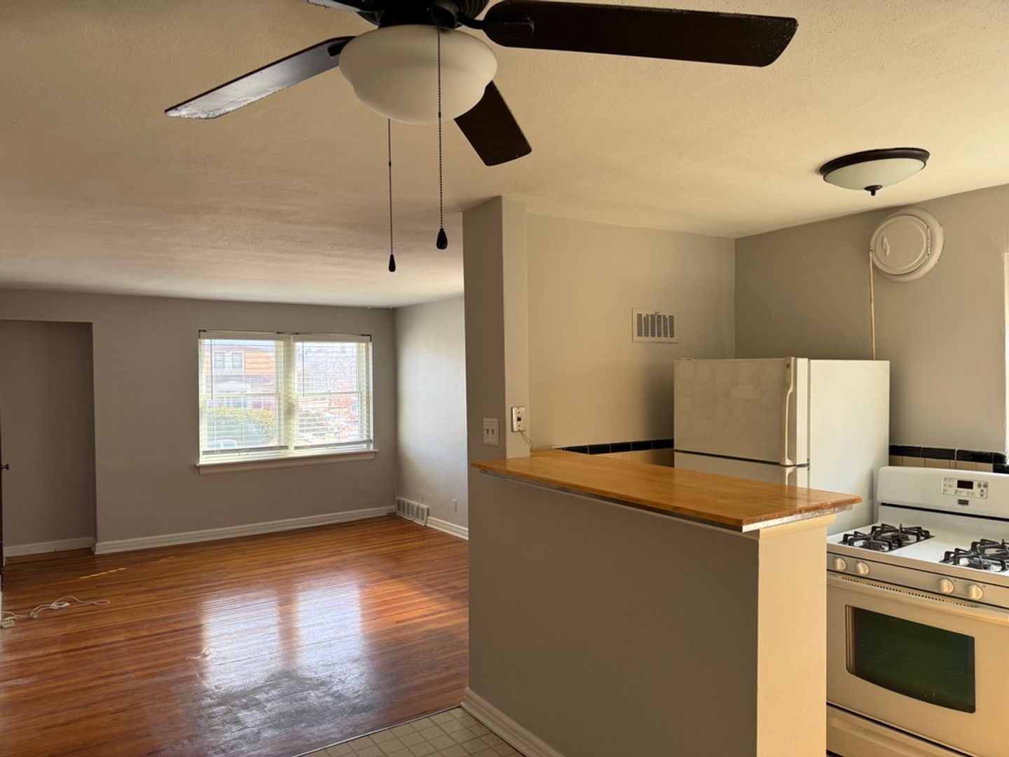 Shiny hardwood floors, ceiling fans, central air, no dishwasher but fully functional kitchen space - there is a lot to enjoy here,