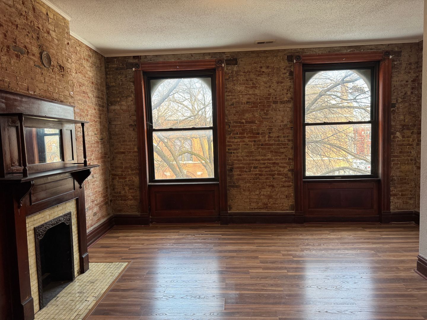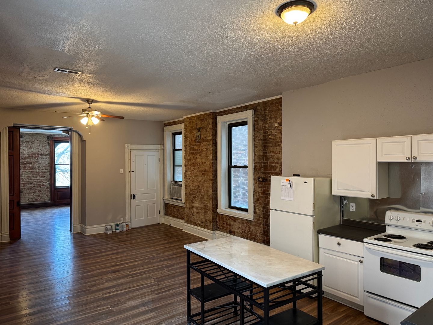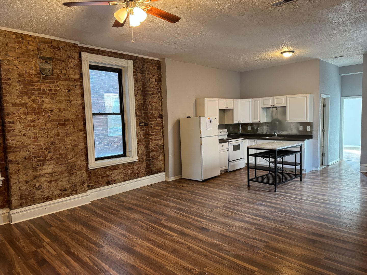 Huge living and dining space with 10 foot ceilings. Ample bedroom in the back. All the charm you would expect in South City, with central air, upgraded bathroom, large kitchen. Fenced back yard. Room overlooking the street could be bonus bedroom or work-from-home office. Front and rear staircase for ease of move-in. Historic brick building is a quiet refuge from the activity on the street.